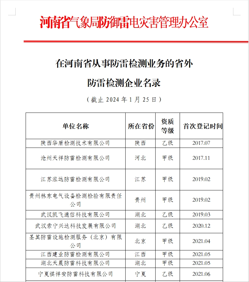 在河南省從事防雷檢測業(yè)務(wù)的省外